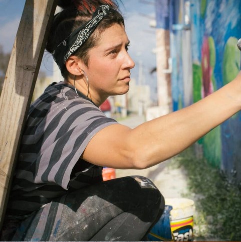 Artista visual y muralista nacida en Coyhaique, Patagonia chilena. Tras egresar de Arquitectura, recorrió Sudamérica durante cinco años en la búsqueda de un lenguaje propio para comunicar artísticamente, encontrando en el muralismo su principal medio de expresión. Sus obras, de carácter realista, integran elementos de fantasía y naturaleza con un componente mágico que refleja el mundo creativo. Ha realizado numerosos murales y participado en festivales de arte urbano en distintos países de Europa y Sudamérica. Actualmente reside en su ciudad natal, desde donde impulsa el desarrollo cultural y artístico de la región.